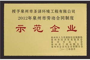 芒果体育泉州市圣泽环境工程有限公司喜获“2012年泉州市劳动合同制度示范企业”荣誉称号