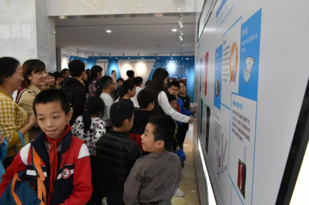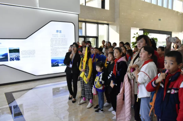 学生家长在一楼环保展厅听讲