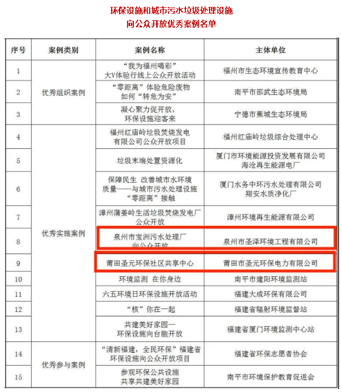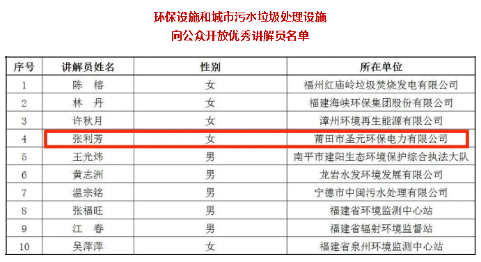 近日,福建省生态环境厅、福建省住房和城乡建设厅公布环保设施和城市污水垃圾处理设施向公众开放优秀案例、优秀讲解员入选名单 。“泉州市宝洲污水处理厂向公众开放”、“莆田芒果体育社区共享中心”被评为环保设施向公众开放优秀案例,莆田芒果体育张利芳被评为环保设施向公众开放优秀讲解员。