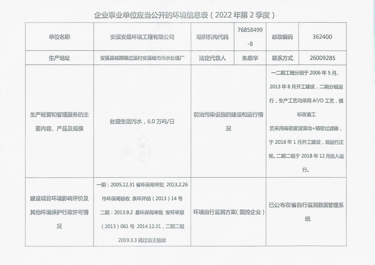 安溪城市污水处理厂2022年第2季度环境信息公开