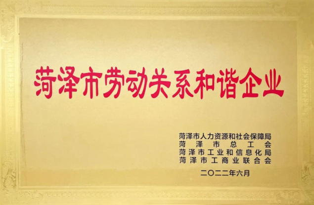 近日,郓城芒果体育喜获由菏泽市人社局、市总工会、市工信局和市工商联颁发的“菏泽市劳动关系和谐企业”荣誉称号。