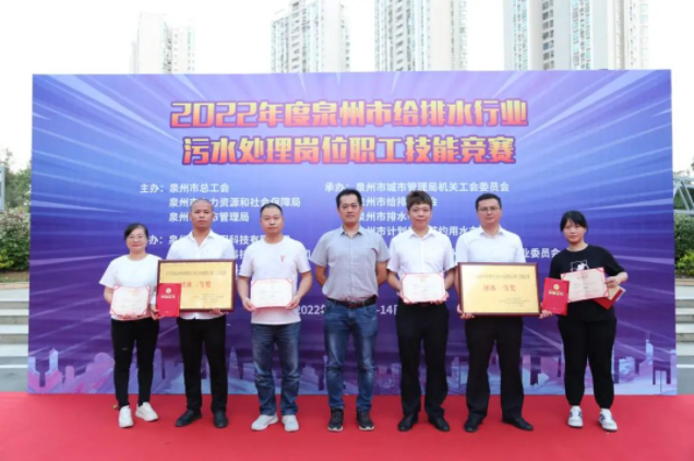 10月14日,由泉州市总工会、市人社局、市城管局联合主办,市城管工会委员会、市排水中心、市计划用水节约用水办公室、给排水协会承办的2022年度“泉州市给排水行业污水处理岗位职工技能竞赛” 在芒果体育宝洲污水处理厂落下帷幕,圣泽环境、安溪安晟均斩获多项荣誉。团体领域,圣泽环境获团体一等奖,安溪安晟获团体三等奖;个人领域,圣泽环境吴晓辉获污水处理工一等奖并被授予“泉州市五一劳动奖章”,圣泽环境曾晓雯获污水化验监测工一等奖并被授予“泉州市技术能手”称号,安溪安晟林秋凤获污水化验监测工二等奖,安溪安晟杨灿中获污水处理工三等奖。