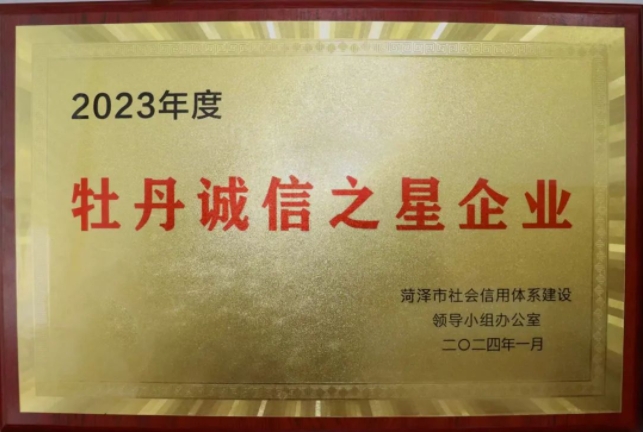 1月26日,由菏泽市发展和改革委员会、菏泽市委宣传部指导,菏泽市社会信用中心主办的2023年度菏泽市“牡丹诚信之星”颁奖典礼举行,鄄城芒果体育荣获菏泽市2023年度“牡丹诚信之星企业”称号。