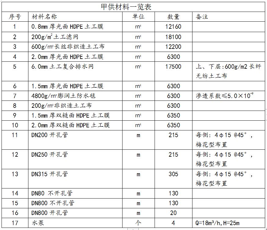 2.3本工程发包人材料范围(详见甲供材料一览表):各型号土工布;各型号HDPE土工膜;各型号土工复合排水网;各型号HDPE管;各型号土工滤网;水泵。除上述发包人供应材料外,其余所有材料均属于承包人的供应范围。发包人供应材料的安装、卸车、保管、二次搬运及材料堆放场地均由承包人负责,且该部分费用已包含在合同固定总价中。