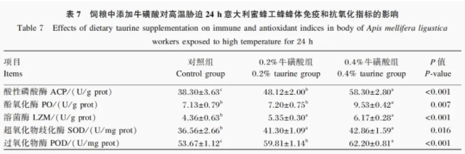 饲粮中添加牛磺酸显著提高了高温胁迫下7日龄意大利蜜蜂工蜂的寿命,提高了蜂体粗蛋白质和粗脂肪含量,增强了工蜂的免疫和抗氧化能力,表明饲粮中添加牛磺酸可以提高7日龄意大利蜜蜂工蜂在高温胁迫下的耐受能力。