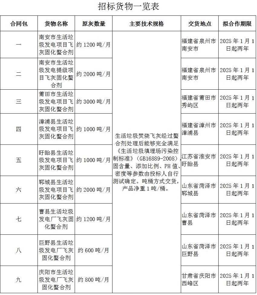 芒果体育对南安市生活垃圾焚烧发电厂、南安市生活垃圾焚烧发电厂提级项目、莆田市生活垃圾焚烧发电厂、漳浦县生活垃圾焚烧发电厂、盱眙县生活垃圾焚烧发电厂、郓城县生活垃圾焚烧发电厂、曹县生活垃圾焚烧发电厂、巨野县生活垃圾焚烧发电厂、庆阳市生活垃圾焚烧发电厂飞灰固化螯合剂采购项目的下述货物及服务进行国内公开招标,现欢迎国内合格的投标人前来提交密封的投标。
