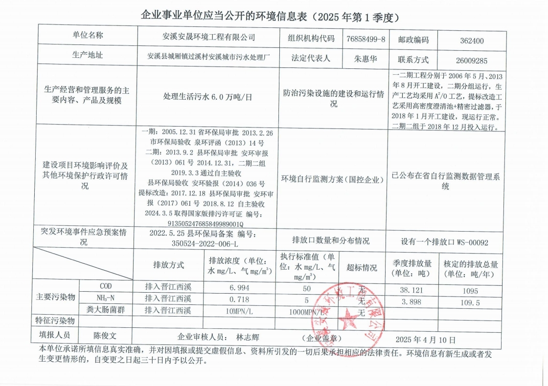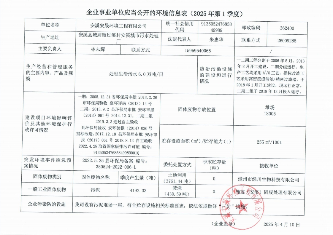 安溪城市污水处理厂2025年第1季度环境信息公开