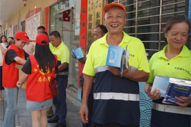 为将关怀精准送达一线,芒果体育工作人员与各社区工会委员、志愿者组成的“送清凉小分队”主动走进美团外卖、山姆、朴朴、顺丰、德邦等外卖、快递站点及物业服务点,将一瓶瓶牛磺酸能量饮料亲手递到汗流浃背的劳动者手中,帮助他们在高温天气中及时补充流失水分、缓解体力疲劳。