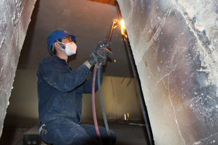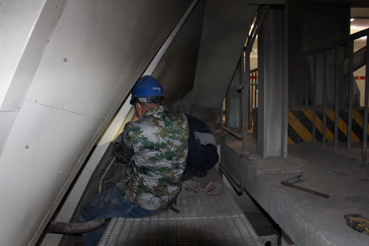 运行员在本次停炉检修中也放弃了休班,加入了检修队伍,他们因检修业务不熟悉,因此主要负责设备的检查、清理工作。脱酸塔工作量较大,为争取提前点炉,运行白班下班后主动请缨帮助外协人员清灰。