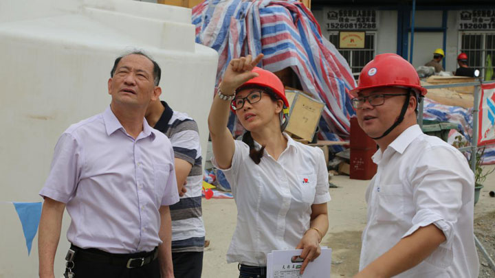 朱煜煊董事长首先对室仔前项目综合楼的内外装修工程进行了深入细致的检查,对装修的效果给予了充分的认可,并与谢炳成总指挥现场研究了一楼大厅外墙的装饰方案。