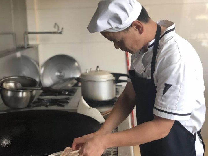 食堂主厨吴新兴精心烹饪中