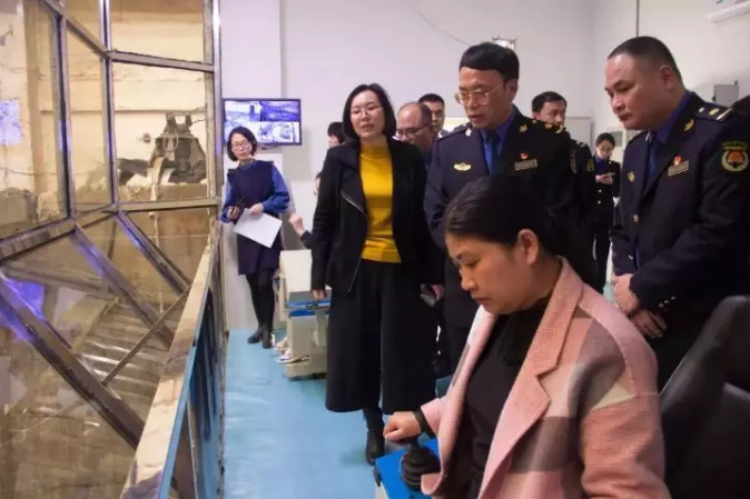 杨宏湘总监引导吴局长一行来到垃圾吊操作室,近距离观察垃圾储坑情况,了解垃圾焚烧前储存发酵流程。
